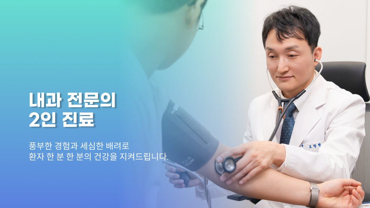 저희 조창현내과는 건강보험심사평가원 적정성 평가에서 고혈압·당뇨병·천식·만성폐쇄성폐질환 부문 1등급 기관으로 선정된 의료기관 입니다.표준화된 진료체계와 꾸준한 관리 성과를 바탕으로 언제나 해당 기준을 충족·유지하며 더 나은 진료 경험을 제공하겠습니다.신뢰받는 건강 관리의 동반자로서 언제나 정직하고 성실한 진료를 약속드리겠습니다.각종 검진 문의는 02-2297-0406 으로 연락주시면 안내 도와드리겠습니다.감사합니다.
